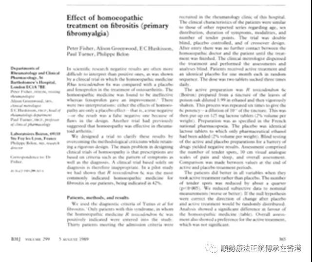 《柳叶刀》(又名《刺针》)(TheLancet),1986 年有关以顺势疗法有效处理鼻敏感的研究:Reilly D, Taylor M, McSharry C, et al., Is homoeopathy a placebo response? controlled trial of homoeopathic potency, with pollen in hayfever as model," Lancet, October 18, 1986, ii: 881-6.